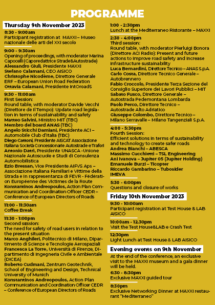 - “Present and future actions to improve road safety and increase infrastructure sustainability” coinvolgeremo i gestori delle strade, per conoscere le azioni presenti e future per rendere le infrastrutture e le strade più sostenibili e sicure