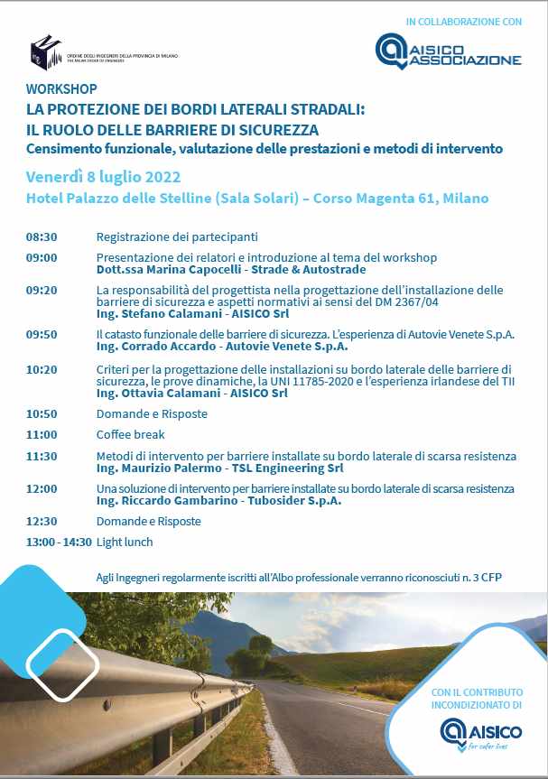 Il prossimo venerdì 8 luglio, a Milano, presso l’Hotel Palazzo delle Stelline (Sala Solari), Corso Magenta 61, si svolgerà un workshop organizzato dall’Ordine degli Ingegneri della Provincia di Milano insieme ad Aisico Associazione Italiana per la Sicurezza della Circolazione con il contributo incondizionato di AISICO Srl.