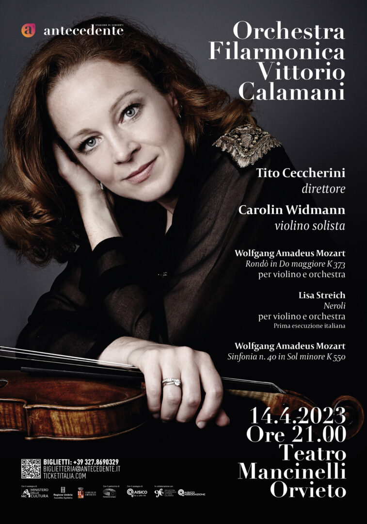 Il 14 aprile al Teatro Mancinelli di Orvieto l’Orchestra Filarmonica Vittorio Calamani sostenuta da AISICO, si esibirà in un concerto sinfonico insieme ad un’artista d’eccezione, la violinista tedesca Carolin Widmann, una delle musiciste più in vista sul panorama internazionale e grande interprete della nuova musica. Esecutrice meravigliosamente versatile, sia come solista sia come camerista, il suo repertorio spazia dai grandi classici alla musica d’oggi, da un’ampia varietà di musica da camera alle nuove commissioni, create spesso appositamente per lei.