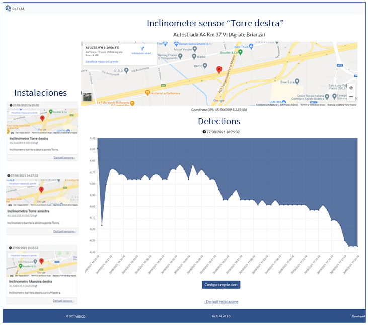 AISICO ha messo a punto un sistema di monitoraggio continuo e automatico da remoto, denominato Re.T.I.M. – Real Time Inclination Measurement, basato su una metodologia brevettata che, tramite rete IoT, misura le deformazioni degli elementi strutturali quali: barriere antirumore, barriere integrate, pali di illuminazione, barriere frangivento, segnaletica verticale, portali, etc.